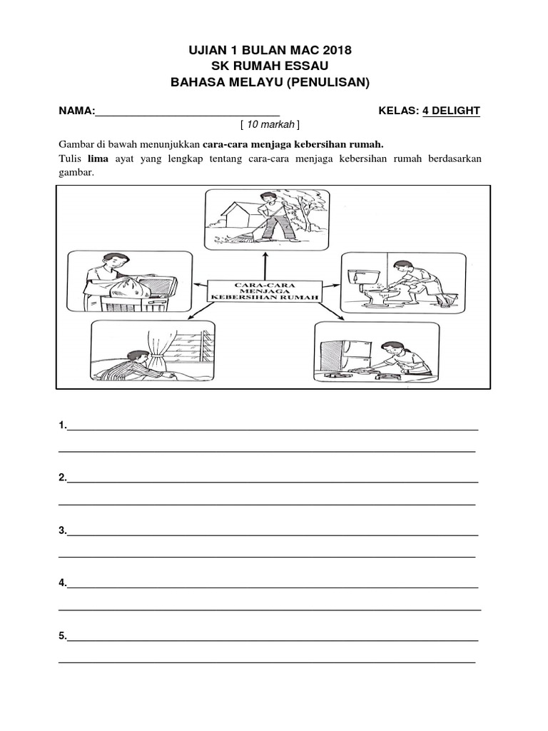 Kertas soalan bahasa melayu penulisan tahun 5 kssr via www.slideshare.net. Mengemukakan soalan dengan penulisan : Untuk pendahuluan sebelum ni biasenye ambik dari arahan.format baru ni pendahuluan kena fikir sendiri dah ke? Soalan percubaan bahasa melayu pt3 via www.slideshare.net. Perkongsian ilmu bahasa melayu upsr, pt3, spm, dan stpm. Upsr, pt3, spm, stpm, muet, tingkatan 1, 2, 3, 4, 5, 6 dan tahun 1, 2, 3, 4, 5, 6 >. Format dan contoh surat rasmi. Peperiksaan akhir tahun english tahun 2 via www.scribd.com. Bahagian a (bina 5 ayat) via yanghuatan.blogspot.com. Soalan bahasa inggeris tahun 1 contoh soalan bahasa melayu via newhairstylesformen2014.com. U maklumat yang kata tanya menggunakan kata tanya dan tanpa kata tersurat. Anda perlu menjawab soalan ini dalam masa yang dicadangkan iaitu satu jam setengah / 90 minit. Sekolah berasrama penuh integrasi selandar: