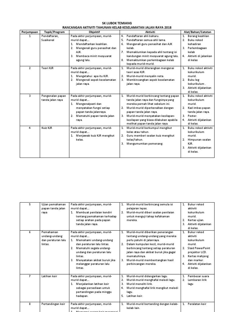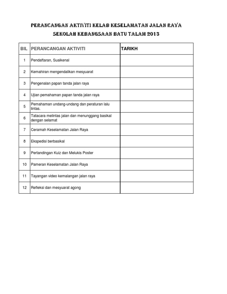 Kelab Keselamatan Jalan Raya Doc from reader012.staticloud.net Secara tidak langsung, masalah kemalangan jalanraya dapat dikurangkan serta dihapuskan dan keselamatan diri dapat dijamin. Aktiviti tahunan kelab keselamatan jalanraya 2019 bulan / tarikh aktiviti objektif sasaran tindakan januari mesyuaratagungkelab semuaahli (berkumpulan) guru penasihat ogos bukuskrap kes kemalangandi jalanraya memupukkesedaranahli tentangbahayakecuaiandi jalan raya. Folio akan dihantar selepas 2 minggu. Pendidikan keselamatan jalan raya bermula dari kandungan ibu. Dikemaskini pada may 8, 2008 at 04:13:25 pm meskipun pada usia yang masih mentah, adalah penting untuk kita mangajar bayi tentang bahaya di dalam kenderaan. ♔kelab keselamatan jalan raya 2014 all right reserved. Perbincangan aktiviti tahunan untuk kelab i. Isyarat keselamatan jalan raya h.p pkjr: