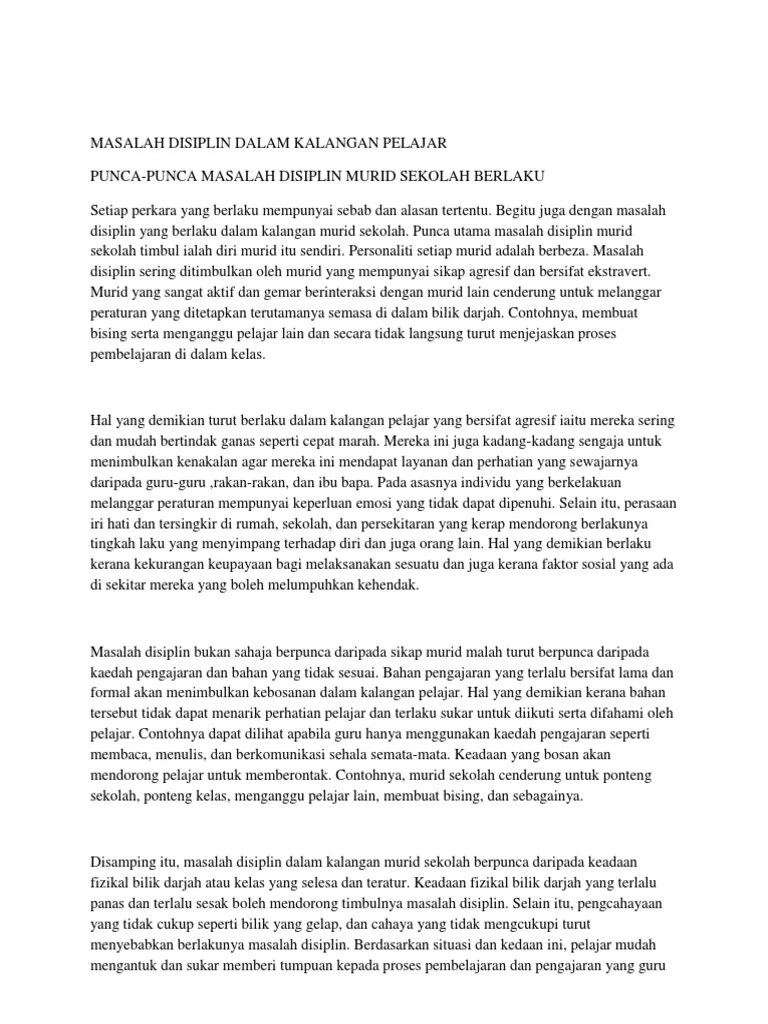 Masalah disiplin sering ditimbulkan oleh murid yang mempunyai sikap agresif dan bersifat ekstravert. Antara perkara yang menggalakkan masalah disiplin berlaku adalah organisasi dan struktur belajar di sekolah seperti pengaliran murid mengikut pencapaian. Mengikut ee ah meng (1990), disiplin merupakan yang dipersetujui oleh. Pihak yang paling utama memainkan peranan dalam mengatasi masalah disiplin pelajar ialah pihak sekolah. 5.0 kesimpulan masalah disiplin para pelajar hari ini tidak boleh dipandang rinfan kerana jika masalah ini tidak dikawal ia akan menjadi parasit dan virus di dalam masyarakat.