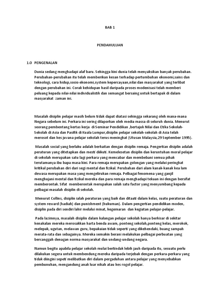 Kegagalan pihak sekolahkurangnya kasih pengaruh sayang dan rakan perhatian. Dada akhbar, malah ada sebahagiannya pada tahap yang membimbangkan seperti gejala buli. Masalah disiplin pelajar merujuk kepada perbuatan salah laku yang melanggar peraturan yang telah ditetapkan oleh pihak sekolah. Orang yang bersabar pasti akan dikurniakan dengan anugerah yang baik sama seperti disiplin diri yang mencabar kemampuan mental kita untuk kekal melakukan sesuatu tugas secara istiqamah sebelum berjaya mendapatkan hasil yang dikehendaki. Terdapat beberapa cara yang boleh dilakukan untuk mengatasi masalah disiplin pelajar. Jadi, disiplin mempunyai kaitan rapat dengan kejadian disiplin pelajar yang terus merosot itu. Masalah disiplin pelajar adalah termasuk dalam ketegori antisosial iaitu seseorang yang mempunyai potensi untuk melakukan jenayah. Yahya bin buntat & saidi bin daud fakulti pendidikan universiti teknologi malaysia abstrak : Kebanyakan masalah disiplin dikatakan satu cubaan meniru kelakuan yang telah mereka tonton sebelum ini. Morris haimowitz dalam artikelnya menyatakan, jenayah adalah dicipta, bukan di lahirkan. salah laku pelajar merujuk kepada tingkah laku yang menyimpang atau Peranan institusi kekeluargaan adalah setaraf dengan peranan institusi sekolah dalam membentuk mental dan rohani pelajar. Berlakunya keruntuhan akhlak atau masalah disiplin di kalangan pelajar. Kes buli dan ponteng sering menjadi masalah disiplin utama dalam kalangan pelajar pada masa kini yang boleh menyebabkan prestasi akademik pelajar menjadi semakin merosot.